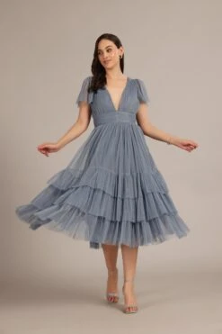 Lace & Beads Avon grey bridesmaid beaded maxi dress with a beautifully embellished bodice and lined tulle skirt. Deep V neckline, adjustable straps, and zip back closure. This flattering hand-embellished maxi is an occasionwear must-have.