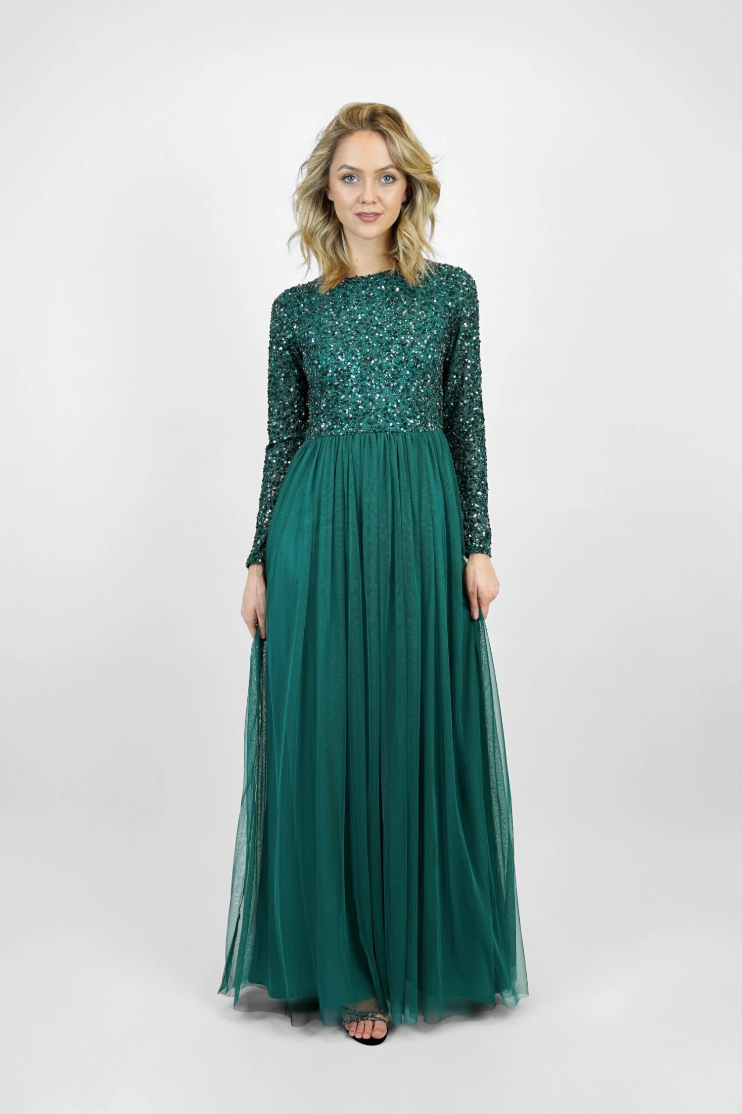 Lace & Beads Belle green long-sleeve bridesmaid dress. Step into elegance with our long-sleeve-embellished dress that demands attention! This stunning dark green dress showcases a captivating hand-embellished top paired with a dreamy tulle skirt.