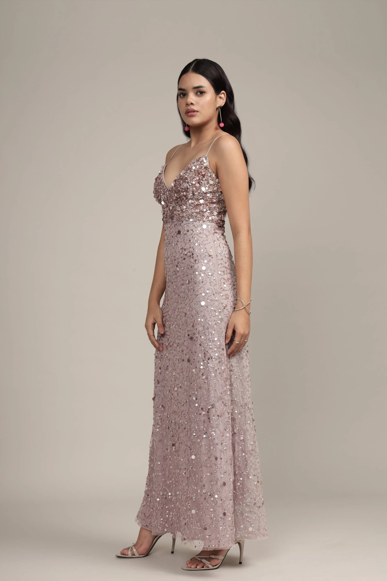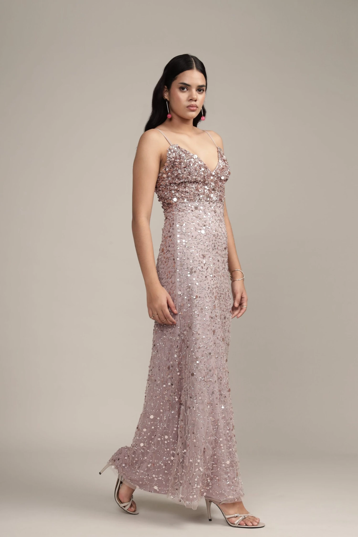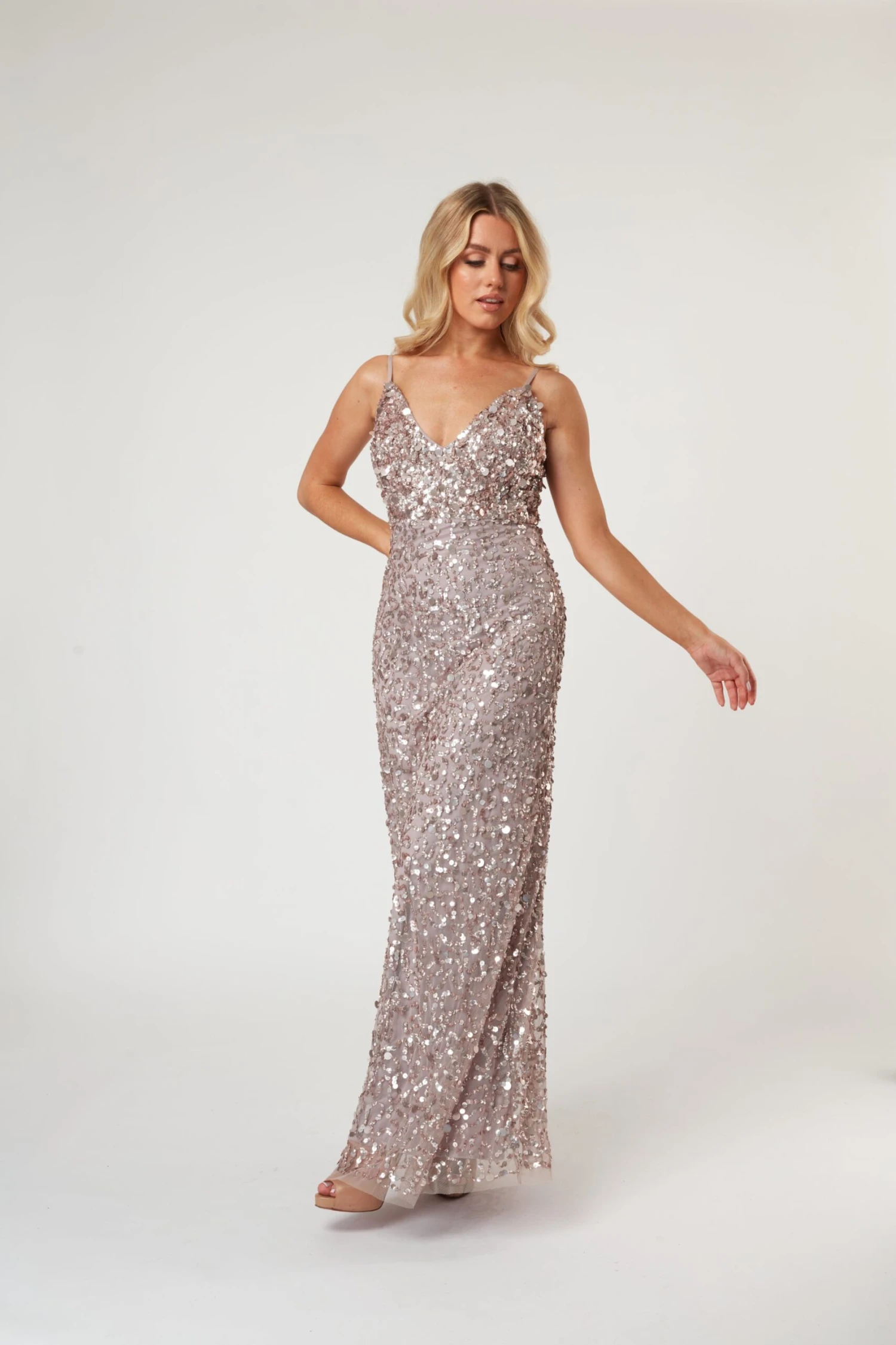 Lace & Beads Betty sequin embellished champagne gown with beading throughout the dress. Detailed with a flattering v-neckline and adjustable straps for a perfect fit. This floor-sweeping, all-over beaded golden gown has an accentuated waist and zip-back closure. Make a glamourous entrance at your next special occasion with this gorgeous champagne evening gown.