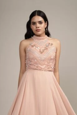 Lace & Beads mink butterfly top hand embellished with taupe sequins. A gorgeous taupe sequin top featuring an easily adjustable halterneck, and tie-back detailing for a flattering fit. This beautifully handcrafted taupe top is the perfect twist to your nude neutral outfit. Dress it up with a blazer to make it a gorgeous going-out top or dress it down with some flared jeans.Â
