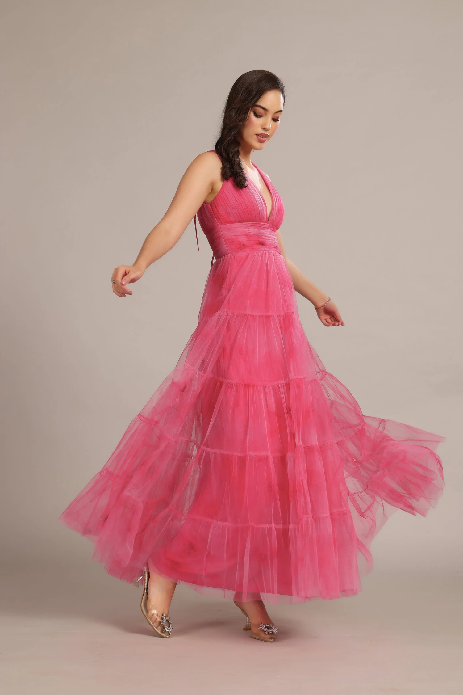 Lace & Beads Candace Maxi Dress in Bright Pink Print. Fun, floaty, this style is made to stand out. Designed with a deep V-neckline and a fitted waistband, it shapes the body in all the right places while keeping things light and easy. The soft tulle layers fall into a full, tiered skirt that moves beautifully as you walk or dance. In a bold, vibrant pink, Candace is perfect for weddings, parties or any occasion where you want to bring a little extra joy to your look