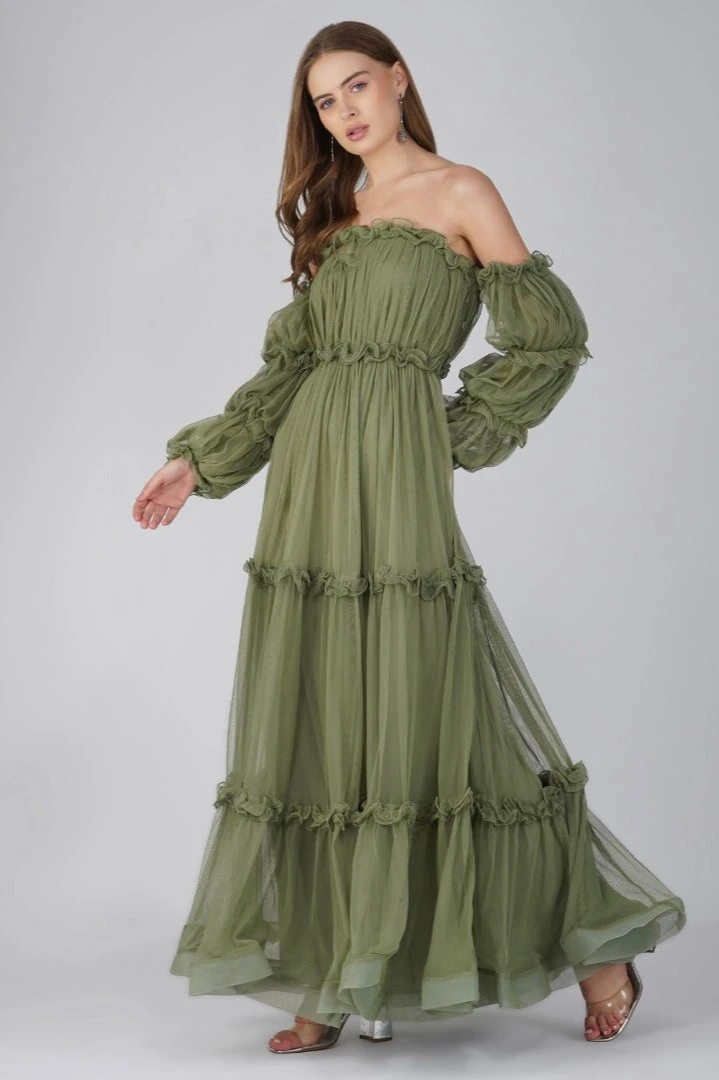 Lace & Beads Emmeline soft olive green tulle maxi dress, a beautiful occasion dress that exudes romance. Designed in a beautiful olive green against ethereal tulle fabric, this dreamy green wedding guest dress captivates with its timeless elegance. Featuring a flattering off the shoulder design, this dress is perfect for a host of occasions.