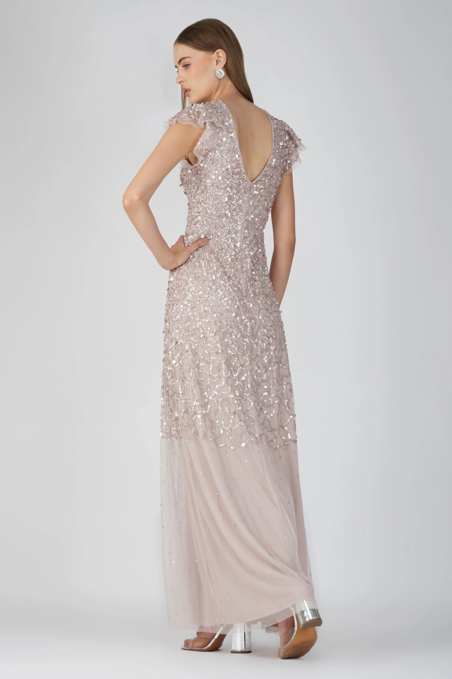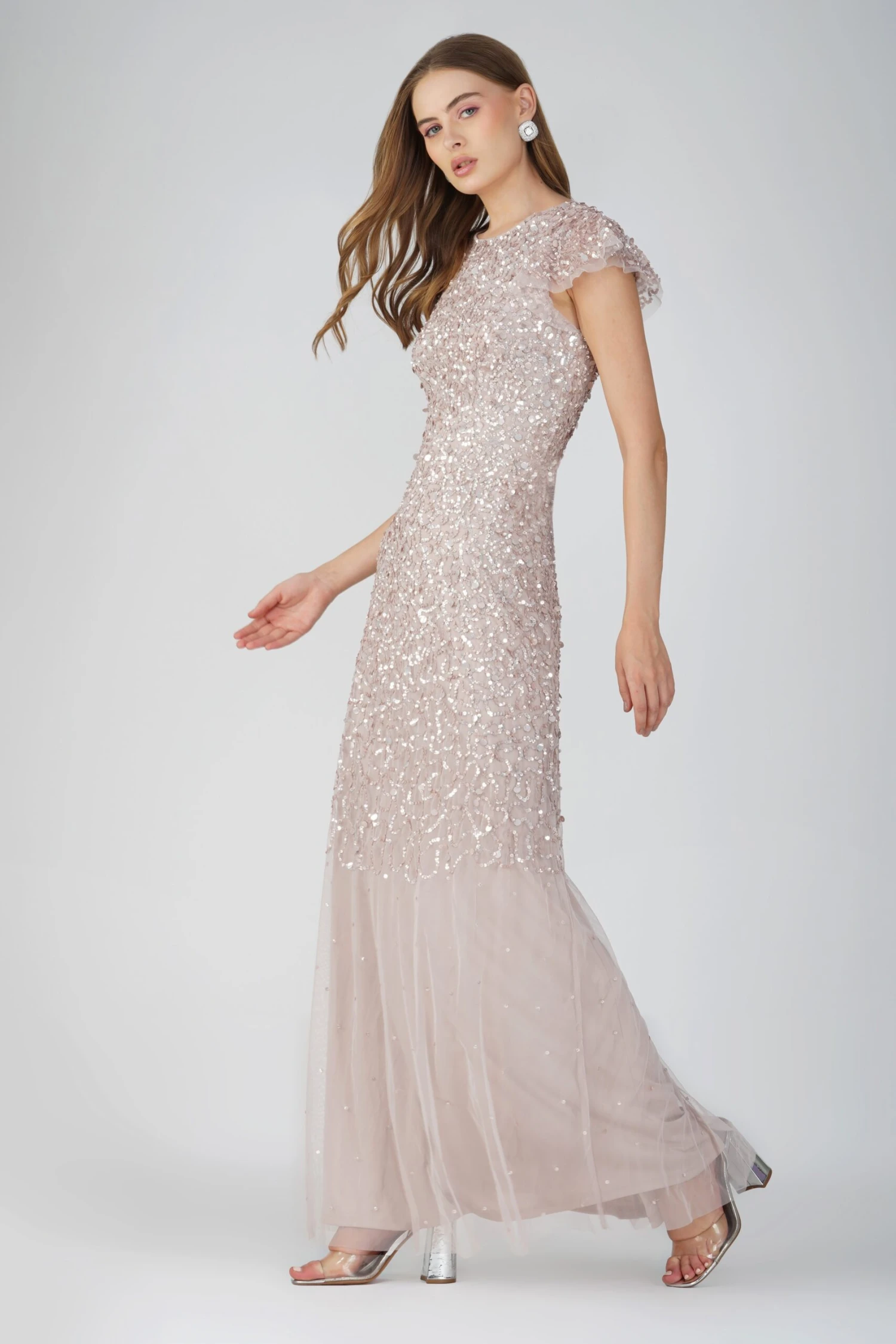 Larissa Short Sleeve Embellished Maxi Dress in Mink. A sequin embellished gown that features short flutter sleeves to add an elegant touch, a zip-back closure, beautiful mink sequins, and a floor-length tulle skirt. This bridesmaid dress is the perfect addition to your wedding. Elevate your wedding guest look this season with this hand embellished gown.Â