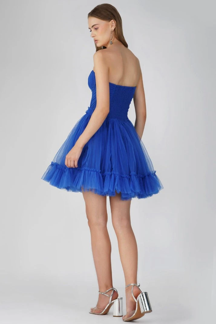 Lace & Beads Lauren structured tulle mini dress in blue. A cobalt blue tulle dress in a tutu shape that features a boned waist and corset-like top. This statement dress has a cinched-in ruched waist and a dramatic tutu skirt. This green dress is an absolutely must-HAVE to make an entrance on your next big night out. It is the perfect option whether you are looking for a blue party dress, a birthday dress, or just a mini dress that will WOW. Add this cobalt tulle mini dress to your wardrobe now. The perfect mesh mini dress for all the occasions.