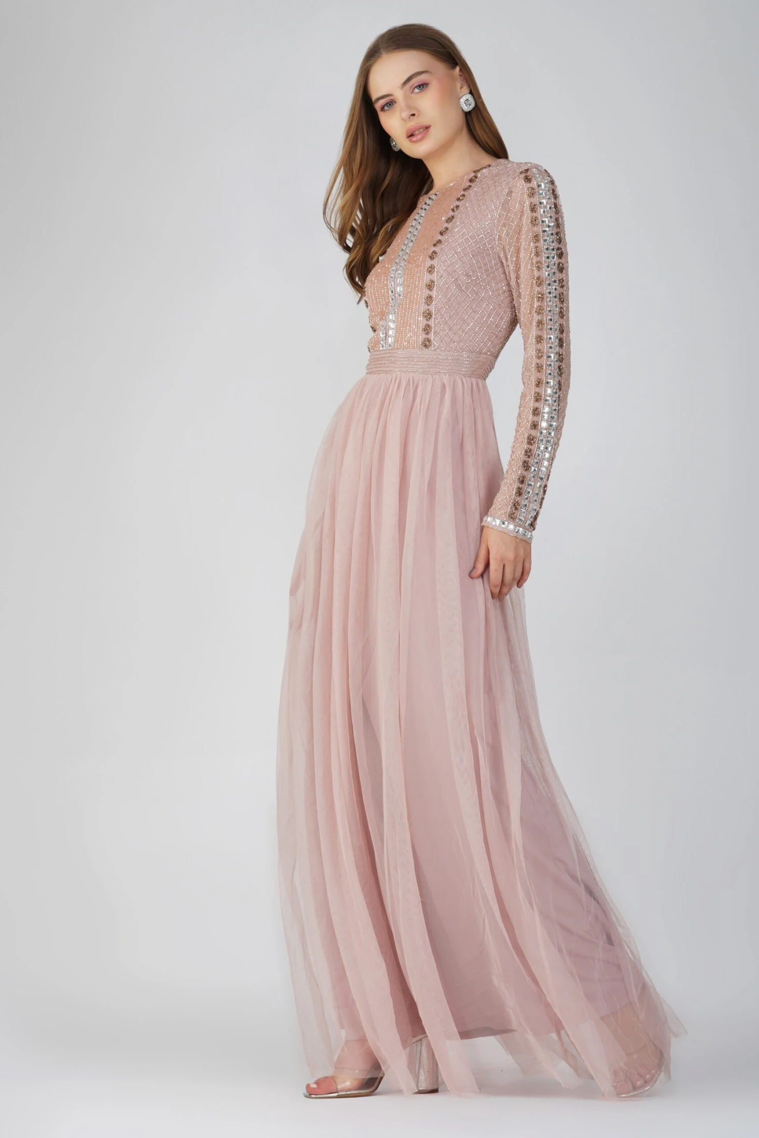 Lace & Beads Melinda Long Sleeve Embellished Maxi Dress in Blush Pink. This stunning long sleeve dress is studded with sequin embellishments, designed with Lace & Bead’s signature elegance to exude beauty, perfect for special events.