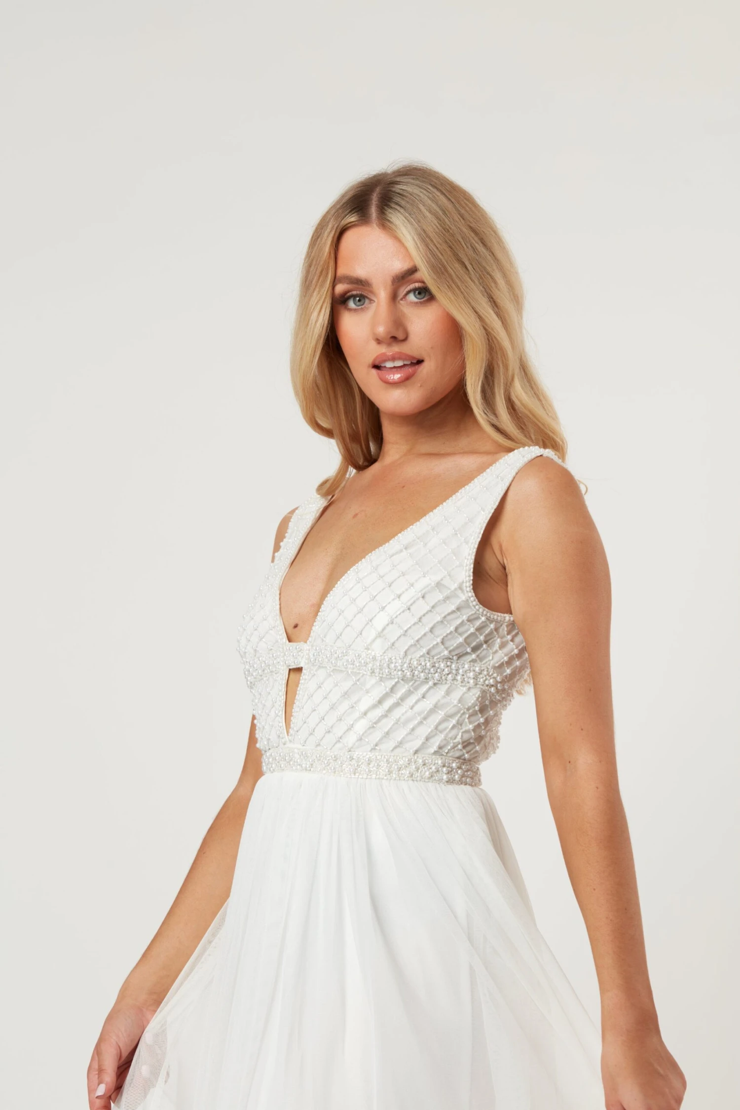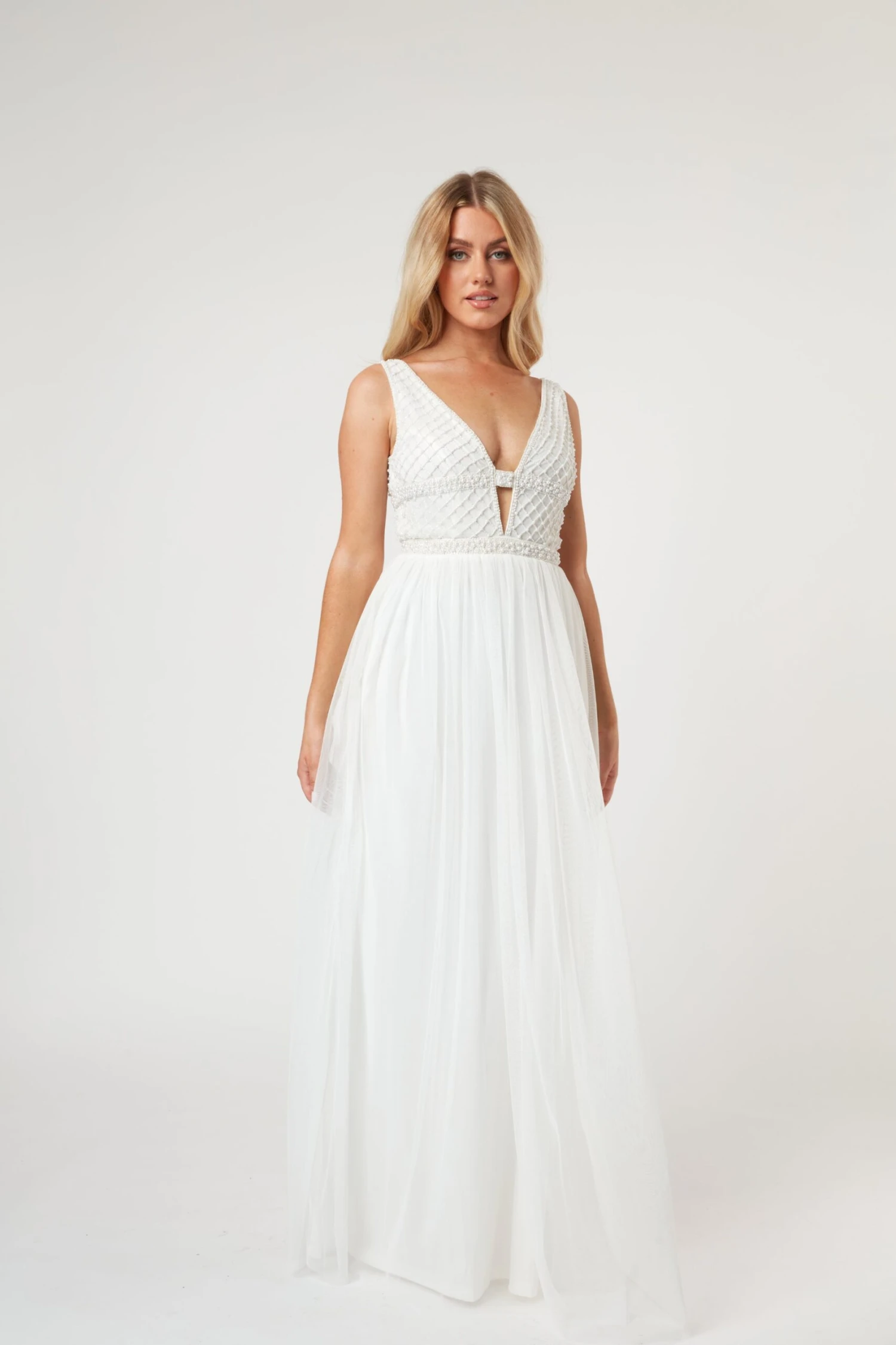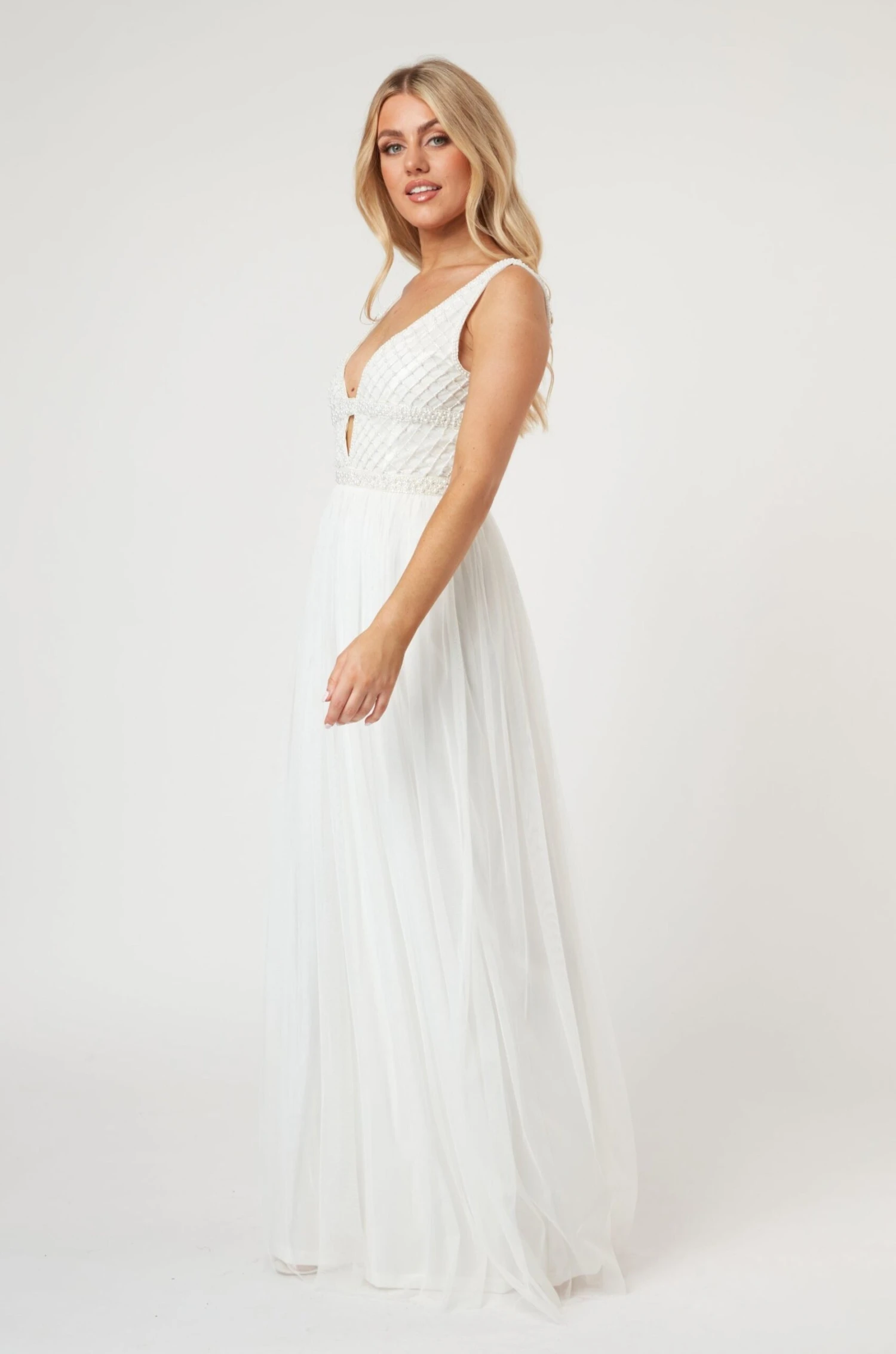 Lace & Beads Lorelei white wedding dress embellished top with sequin and pearl beading and finished with a lined tulle flowy skirt. This wedding dress features a plunging v-neckline front showcasing the cinched waistline with the beaded band to give an ultra-flattering look. This white maxi dress has a low backline with open-back detailing. It is an a-line beaded wedding dress that is the perfect choice for you if you are looking for an elegant bridal look. An affordable wedding dress that will have you looking great!
