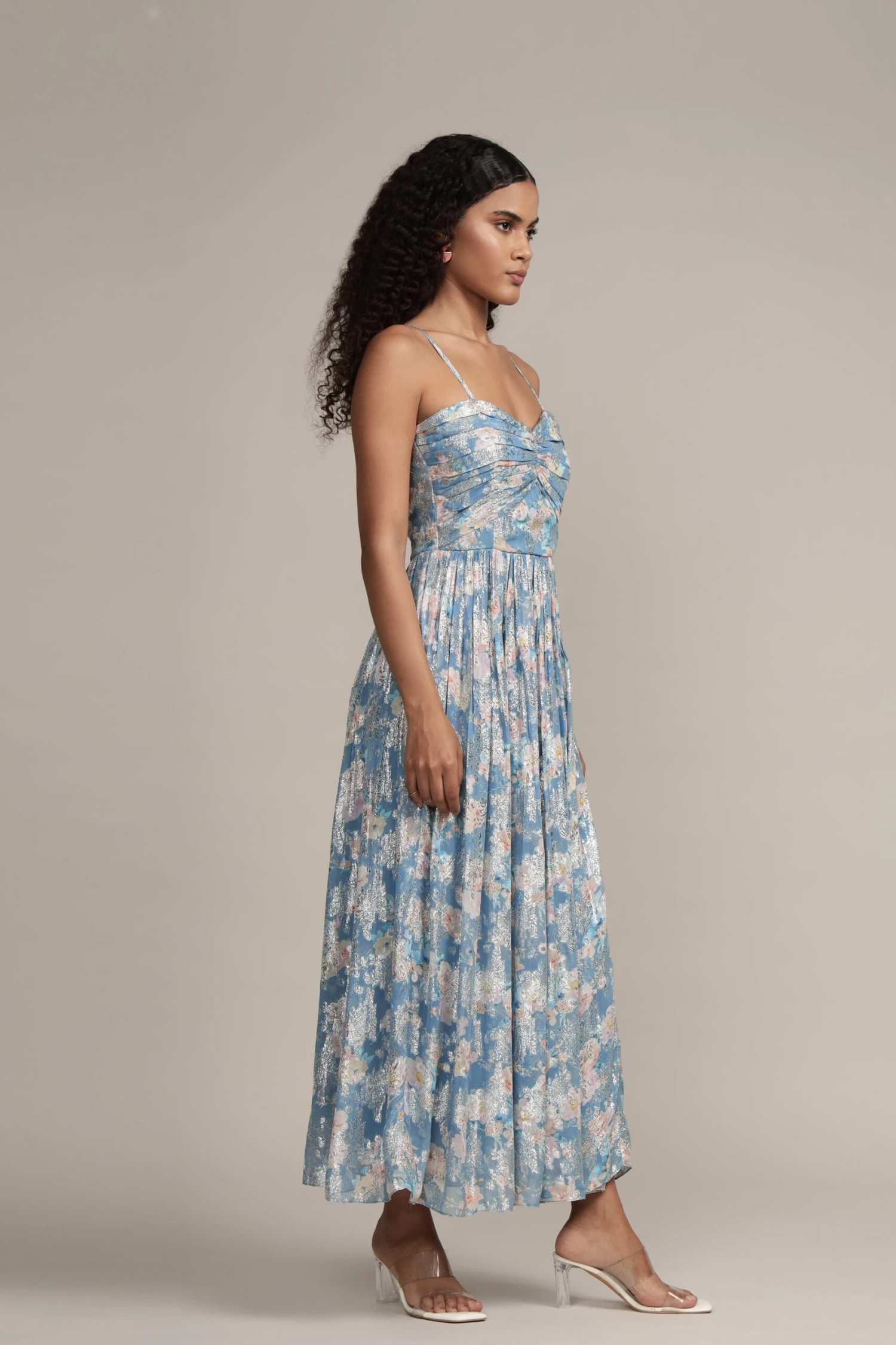 Lace & Beads Nelex blue floral dress. Playful metallic print shimmers throughout this beautiful floral print dress. This is the perfect summer occasion dress for all your upcoming events. The flowing skirt with a fitted bodice accentuates the waist of this floral dress. The light blue dress features a pretty floral print that are accentuated by metallic details.
