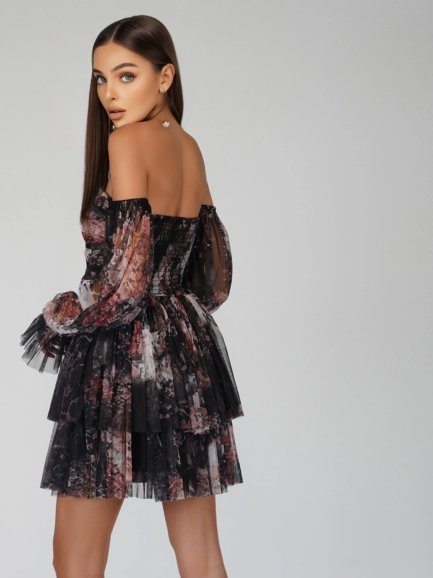 Lace & Beads Roxanne printed tulle sleeveless mini dress. A dark printed tulle dress that features a layered tulle skirt and off-the-shoulder sheer sleeves. The fitted bust and flowy skirt give a beautiful silhouette. This printed mini dress has a shirred back giving a flattering fit and puff sleeves creating an utterly romantic look. Get all dressed up with the bardot tulle mini dress.