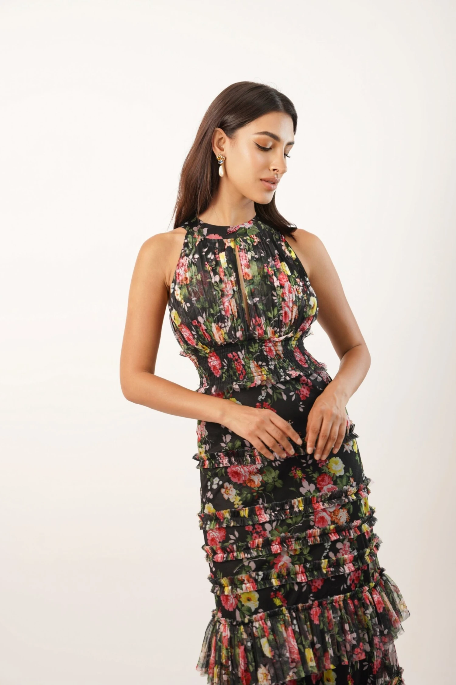 The form-fitted bodice gives a gorgeous silhouette, and the layered detailing on the skirt adds a subtle yet captivating dimension to the dress. It’s not just a black floral dress; it’s a statement piece that’s perfect for all your occasions.