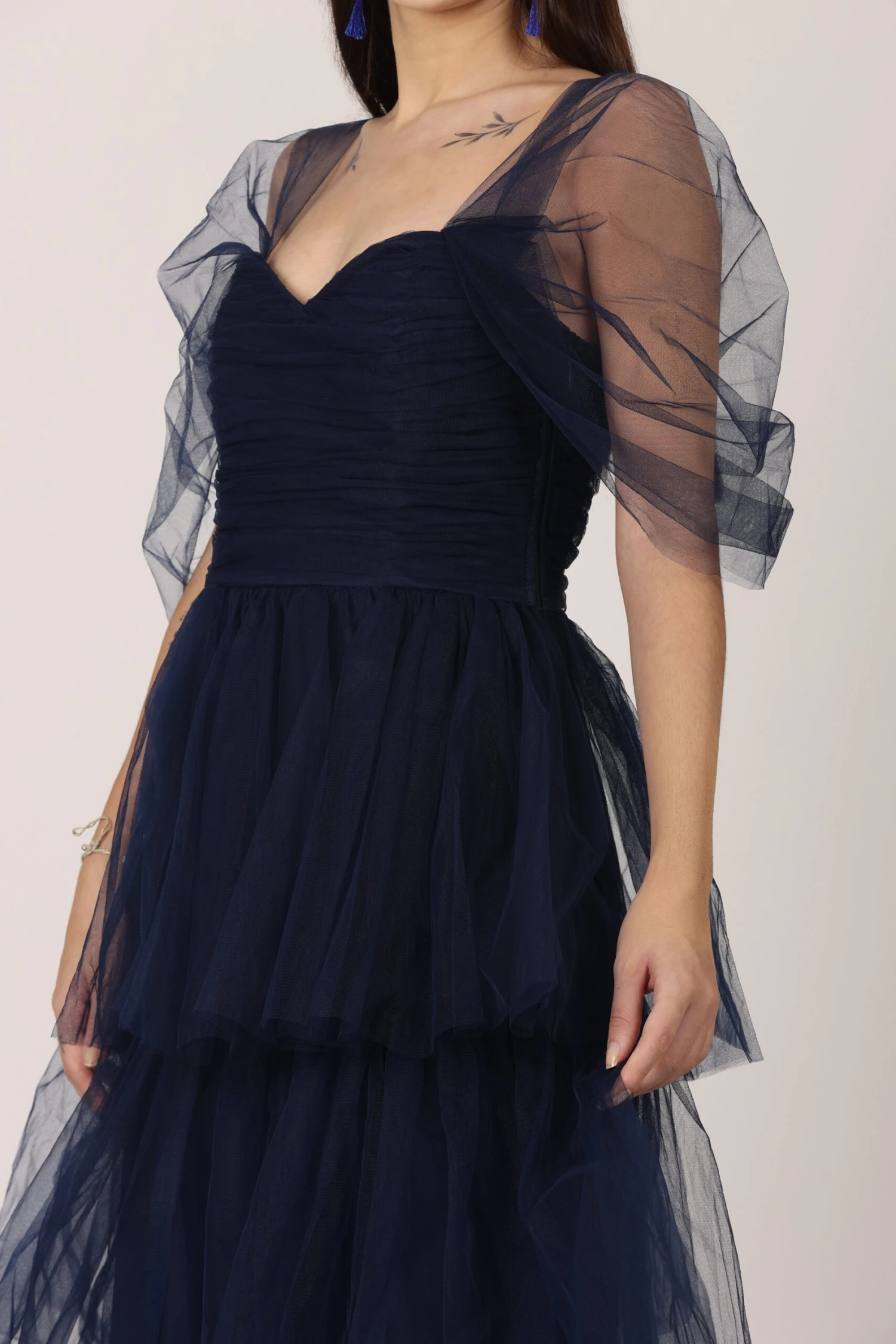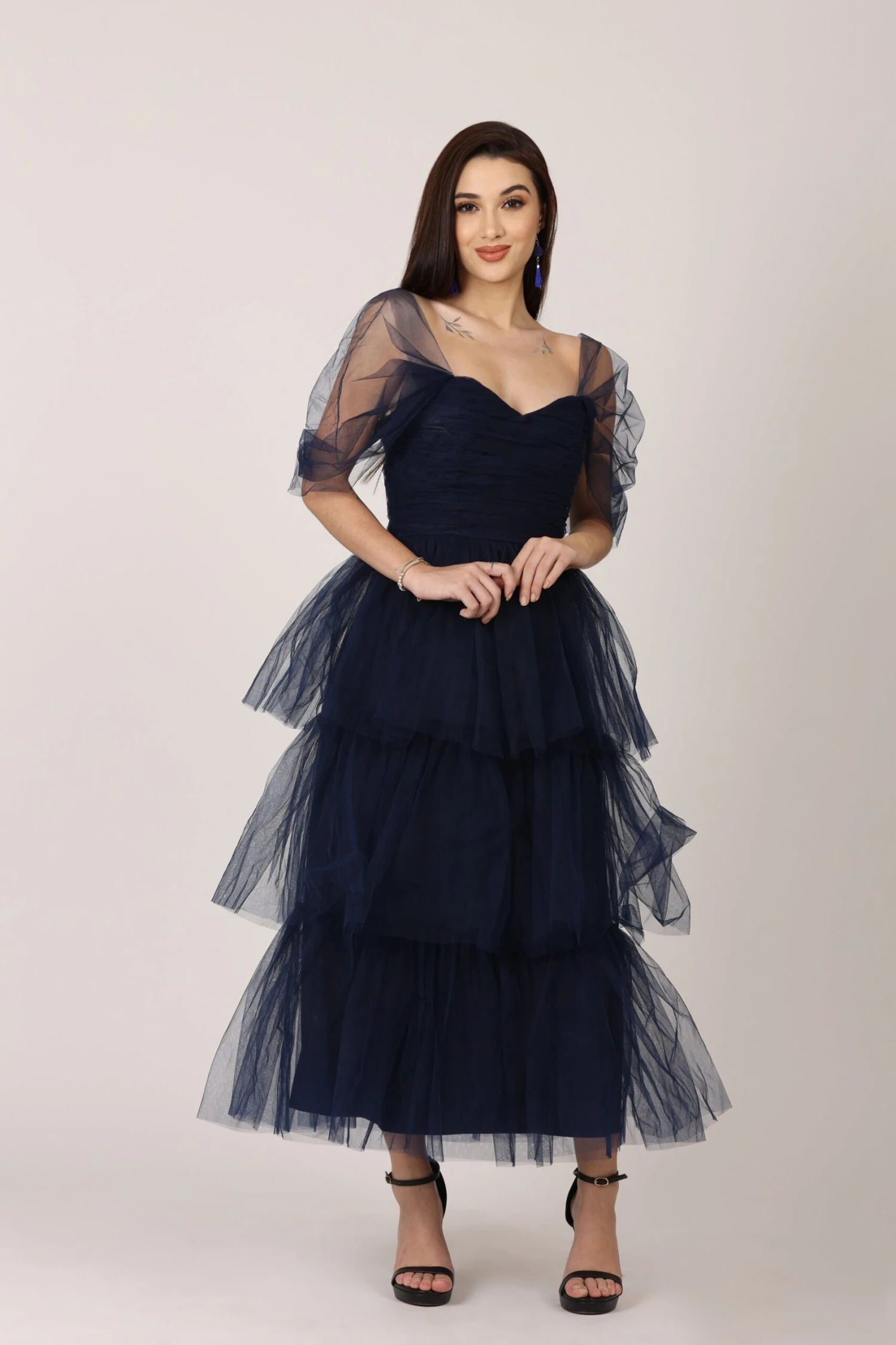 Lace & Beads Sydney navy mesh midi dress. An off-the-shoulder tulle midi dress that features a sweetheart neckline, a wrapped bodice, and a shirred back for a flattering look. This navy midi dress is the stand-out dress you have got to have! It is the ultimate statement tulle midi dress and an absolute must-have for your next occasion.