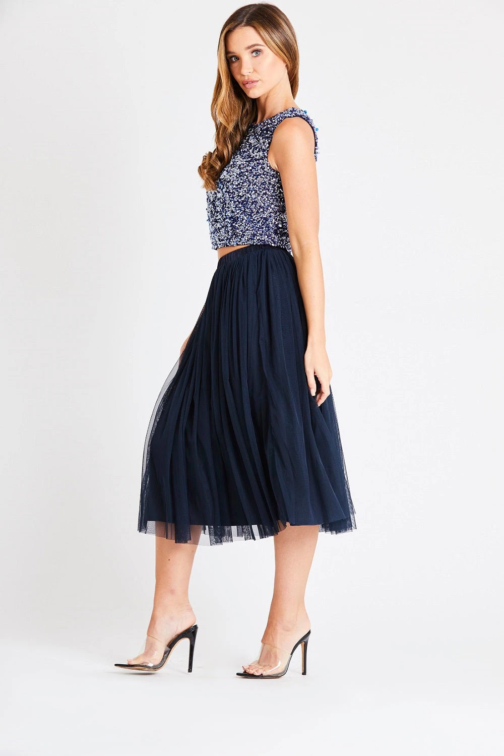 Lace & Beads tulle pleated style skirt with a satin elasticated waistband in navy. Easy to dress up or dress down.