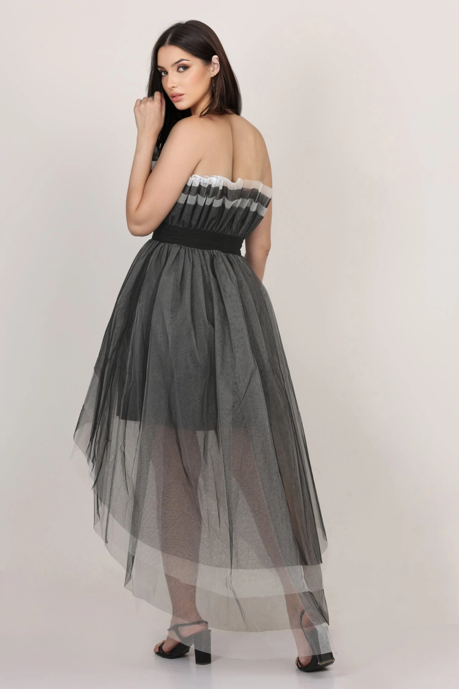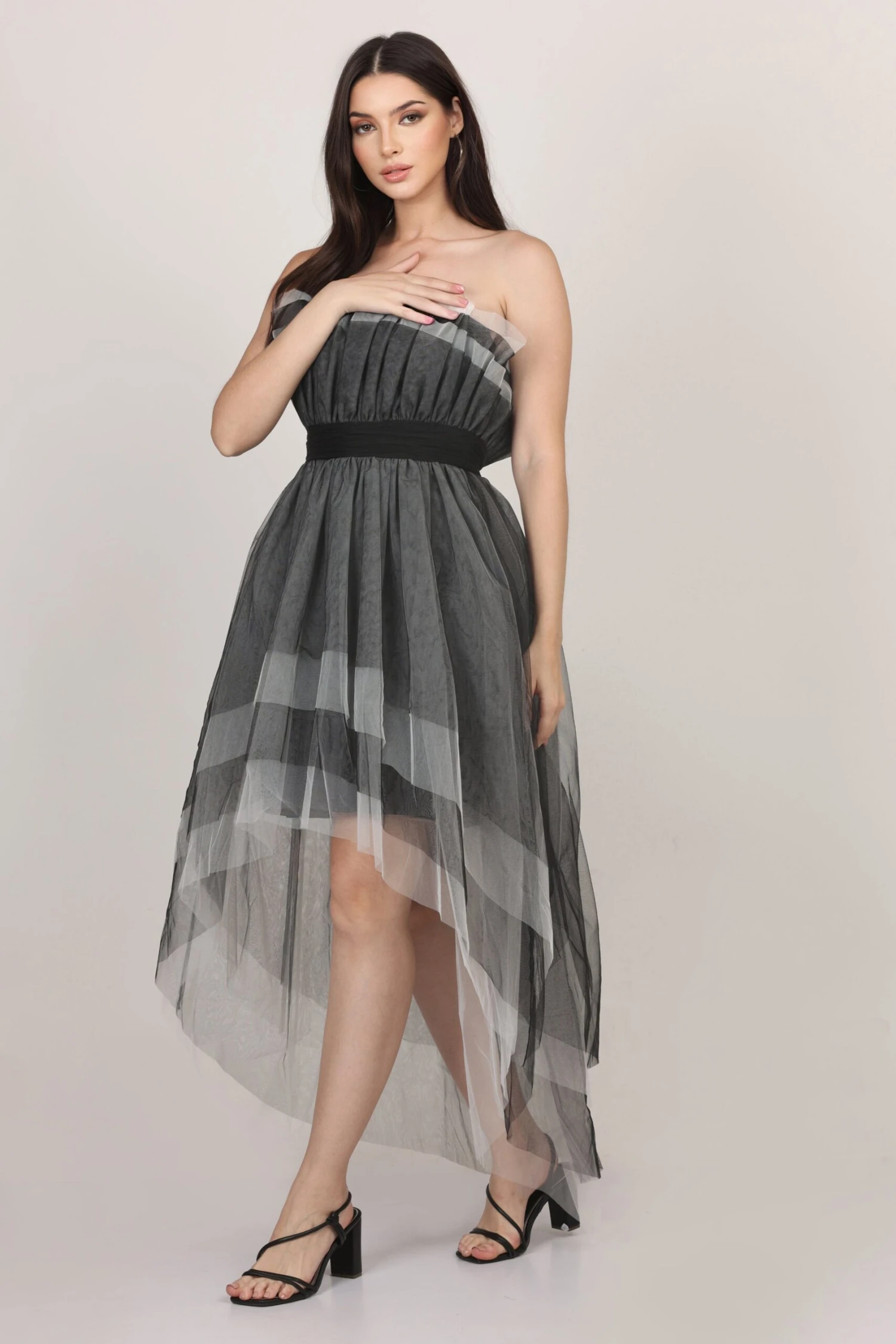 Lace & Beads Wednesday High Low Tulle Dress in Black & White—a captivating blend of elegance with a playful twist. This black midi dress steals the spotlight with its strapless design, creating an alluring silhouette. The high-low hemline introduces a playful twist, allowing you to showcase your legs while maintaining an undeniably elegant look.